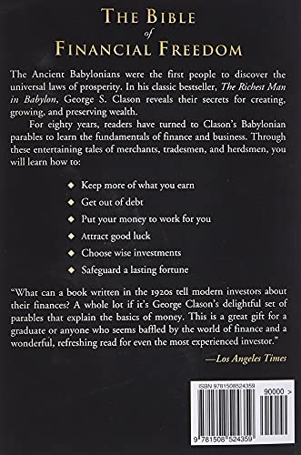 Details: Product Description This is the complete, original 1926 edition of a classic. (A condensed, simplified retelling is also available under the title The Richest Man in Babylon: Six Laws of Wealth, ISBN 1490348557.) "As a young man, I came across George Samuel Clason's classic book The Richest Man in Babylon, which offered commonsense financial advice told through ancient parables. I recommend it to everyone." --Tony Robbins, Money: Master the Game The ancient Babylonians were the first people to discover the universal laws of prosperity. In his classic bestseller, "The Richest Man in Babylon," George S. Clason reveals their secrets for creating, growing, and preserving wealth. Through these entertaining tales of merchants, tradesmen, and herdsmen, you'll learn how to keep more out what you earn; get out of debt; put your money to work; attract good luck; choose wise investments; and safeguard a lasting fortune. Visit SuccessBooks.net for more of the greatest success guides ever written. Review "As a young man, I came across George S. Clason's classic 1926 book The Richest Man in Babylon, which offered commonsense financial advice told through ancient parables. I recommend it to everyone." --Tony Robbins, in Money: Master the Game "This is a great gift for a graduate or anyone who seems baffled by the world of finance and a wonderful, refreshing read for even the most experienced investor." -- Los Angeles Times About the Author Visit SuccessBooks.net, or click on "Best Success Books" or "Charles Conrad" on this page, to view our other new editions of the greatest success books of all time. A condensed version of this book is also available: The Richest Man in Babylon: Six Laws of Wealth by Charles Conrad.